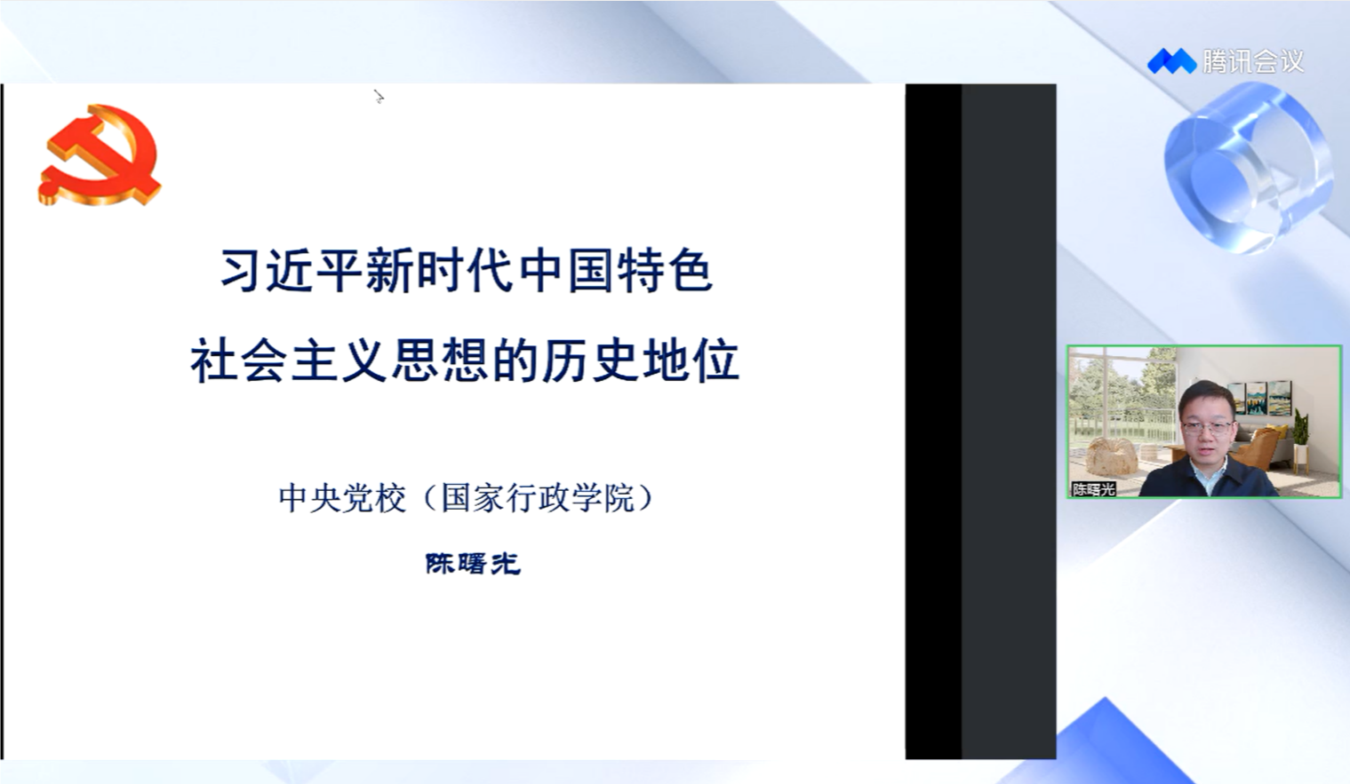2023年4月22日下午,马克思主义学院邀请中共中央党校(国家行政学院)陈曙光教授走进我校思政课课堂,作《习近平新时代中国特色社会主义思想的历史地位》专题报告。报告采取“腾讯会议+直播”的形式进行,我校2021级和2022级本科生、校学生党校“求理”分部暨青年马克思主义研修班学员、马克思主义学院师生共同聆听报告。马克思主义学院党委书记高宁主持报告会。