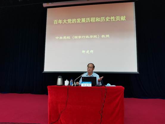 柳建辉教授以中国共产党“革命”、“建设”、“改革”、“强国”的历史发展脉络为主线,结合习近平总书记在党史学习教育动员大会上的重要讲话精神,介绍了《中国共产党简史》的内在逻辑和内容,梳理了中国共产党独立自主、艰辛探索、彰显特色、坚定自信的四大鲜明发展特征以及救国、立国、富国、强国的历史性发展贡献等。用历史事实诠释了中国共产党的一百年,是矢志践行初心使命的一百年,是筚路蓝缕奠基立业的一百年,是创造辉煌开辟未来的一百年。引导全体师生要重点理解习近平总书记三个“起来”、三大历史性飞跃的重要论述和科学归纳,深刻理解中国共产党百年来开辟的三条独特道路、实现的三次历史性转变、取得的根本性成就。