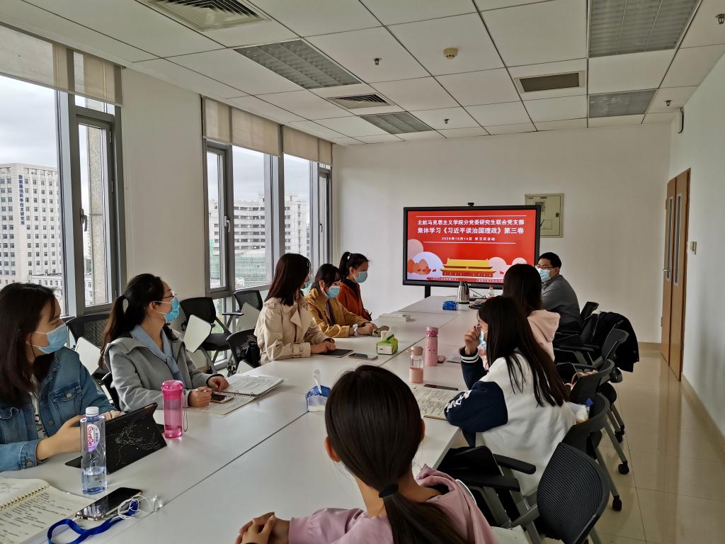为全面深入学习贯彻落实习近平新时代中国特色社会主义思想和党的十九大及十九届二中、三中、四中全会精神,学深悟透《习近平谈治国理政》第三卷,马克思主义学院研究生党支部于10月14日组织开展了以集中学习《习近平谈治国理政》第三卷为主题的“马院青年原著读书会”党日活动。党支部副书记陈思康同志向大家传达了《中央宣传部、中央组织部关于认真组织学习<习近平谈治国理政>第三卷的通知》,并强调支部全体成员要认真学习深刻领会其中精神,要发挥学科专长,阅读经典原著,将马克思主义原理与实际相联系,始终坚持以习近平新时代中国特色社会主义思想为行动指南。