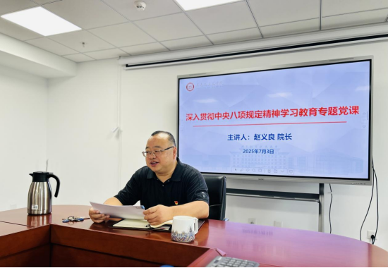 随后,赵义良院长详细解读了中央八项规定及其实施细则精神,强调其核心在于保持奋发进取之态、发扬干事创业作风。基于此,赵院长聚焦学风建设,建议全体学生研究真问题,避免学术上的形式主义和官僚主义,在大量阅读中建立起自主的逻辑体系,从实际问题出发,做扎实学问。