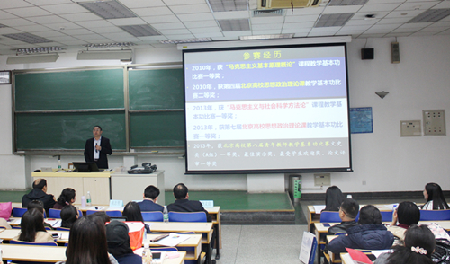 首都师范大学马克思主义学院副院长、教授、博士生导师黄延敏为参赛教师做了赛前辅导。他除了介绍此次比赛的程序、评价体系之外,重点结合2016年习近平总书记在全国高校思想政治工作会议上的讲话以及《关于加强和改进新形势下高校思想政治工作的意见》等文件,从教学态度、教学内容、教学组织和教学效果四方面,就如何提高思政课教学水平与参赛教师们做了深入交流。曾在北京高校青年教师教学基本功比赛中获得最高奖项的两位青年教师——北航马克思主义学院的高宁副教授和首都师范大学马克思主义学院的祝志男副教授,分别结合自己的参赛经验,生动幽默地讲述了参加此项比赛的讲课技巧与心得体会,令在场参赛教师获益匪浅。